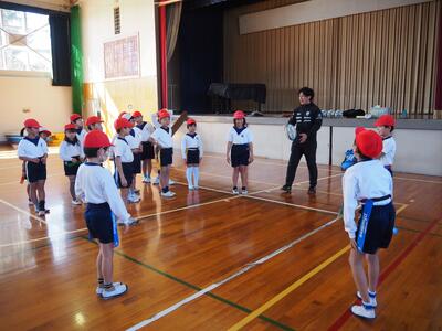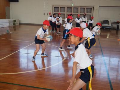 タグラグビー講座【3年生】 投稿: ホームページ編集者 (02/19) 2月18日(水) 静岡ブルーレヴズのタグラグビー講座が行われました。 第1回目の今回は、基本的なルールやパスの出し方を教わりました。 ディフェンスも様になっています。