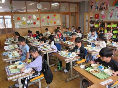1年生初めての給食 投稿: ホームページ編集者 (04/13) 今日から給食が始まりました。 1年生は初めての給食でした。 給食の配膳を始めると「おいしそう」「お腹空いた」「何の味噌汁?」と興味津々。 担任の先生から配膳の仕方、牛乳パックの開け方など一つ一つ教えていただきました。